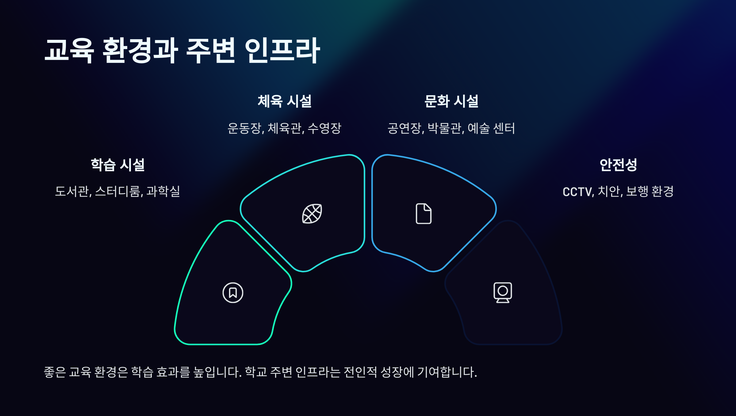 다음은 🌳 교육 환경과 주변 인프라 섹션이에요! 학교만 잘 봐선 안 돼요. 학교 주변 환경, 독서실, 학원가, 공원, 도서관 등도 함께 봐야 해요! 😊🌲