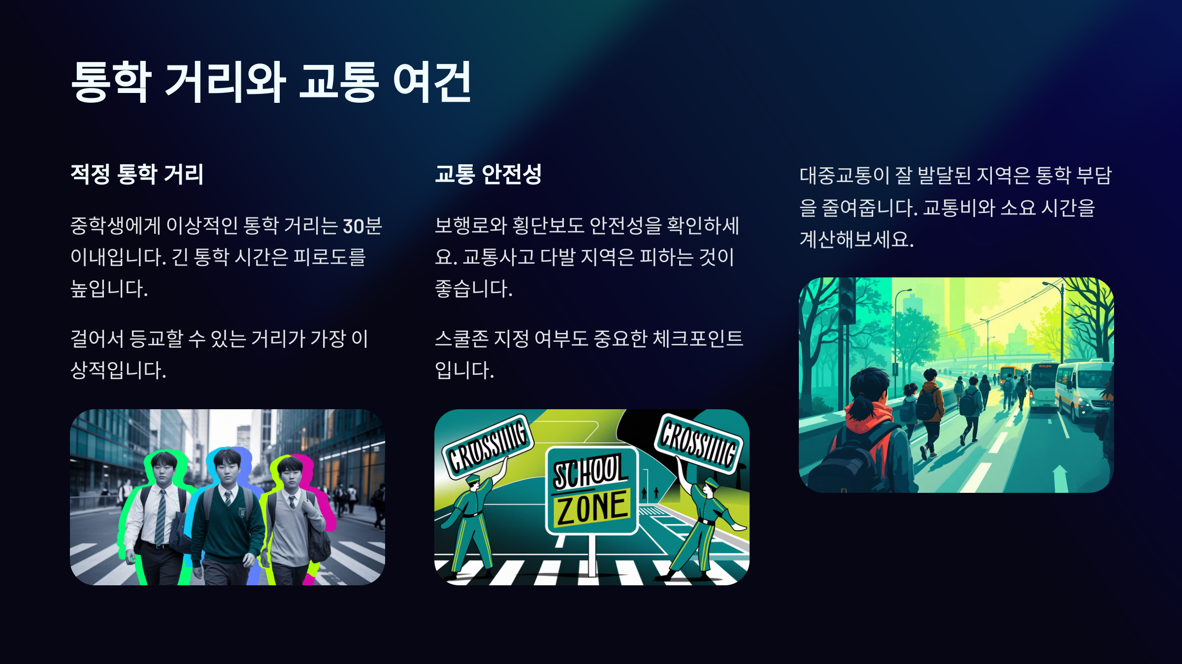 다음 섹션은 🚶 통학 거리와 교통 여건이에요! 매일 다녀야 할 중학교인 만큼, 도보·버스·자전거 등 실제 통학 편의성도 꼭 고려해봐야 해요 😊🚲