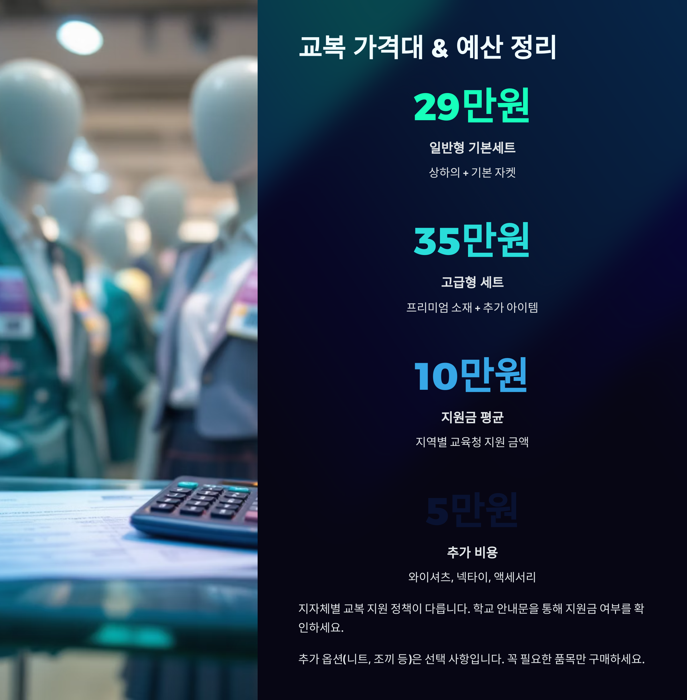 💰 중학교 교복은 기본세트(동복 상·하의, 조끼 또는 베스트) 기준으로 보통 20만~30만 원 내외예요. 브랜드, 지역, 옵션에 따라 가격 차이가 생겨요. 여기에 생활복, 체육복까지 추가하면 예산은 40만 원을 넘기기도 해요.