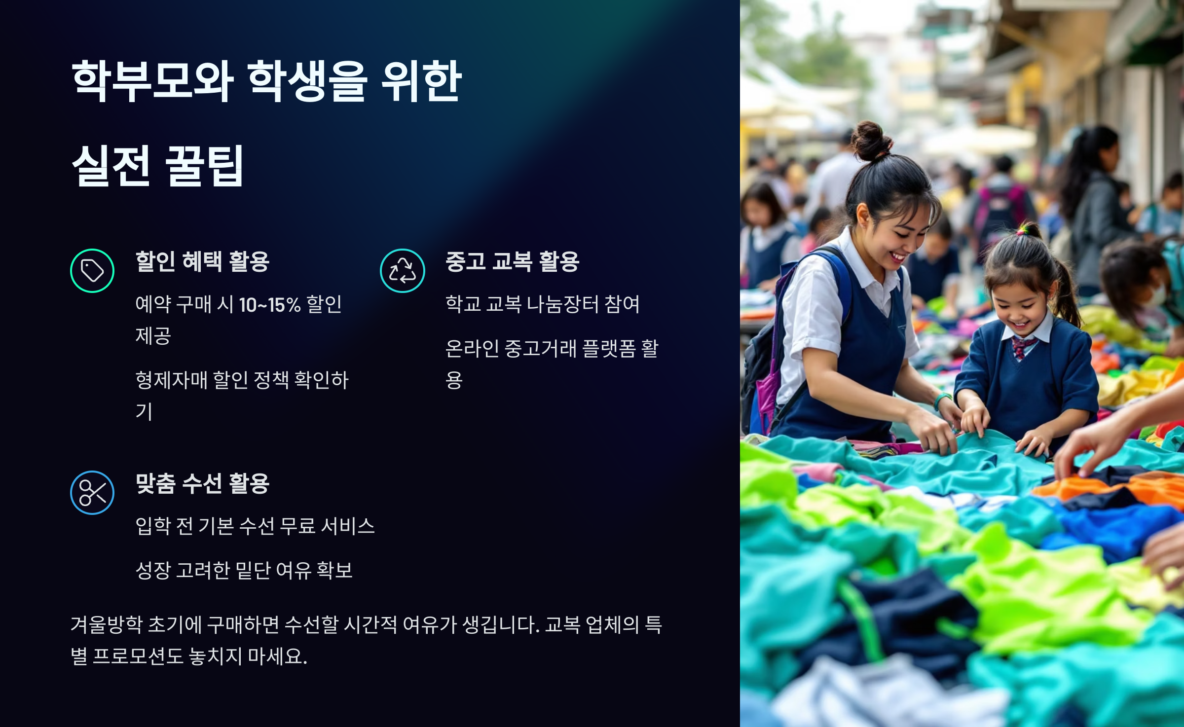🧑‍💼 학생이 알아야 할 팁은 ‘교복은 매일 입는 만큼 편해야 한다’는 거예요. 처음엔 멋부리려 너무 딱 맞게 입는 경우가 많은데, 앉고 걷고 움직일 때 불편하지 않아야 하루가 편해요!