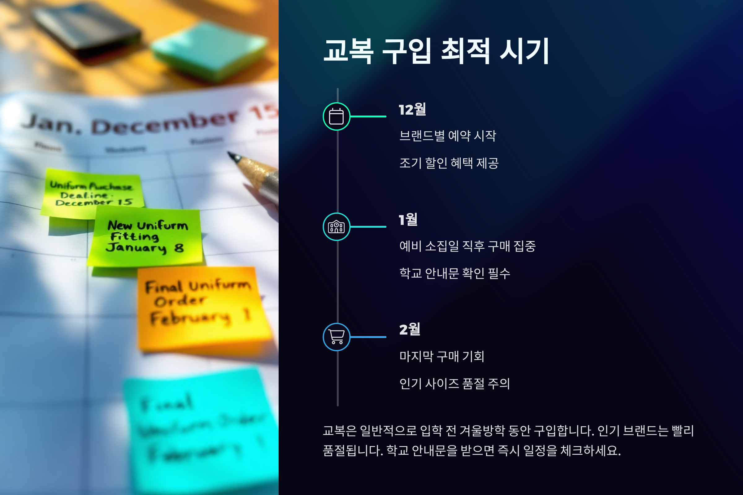 📣 핵심은 12월 중순 ~ 1월 말까지 완료예요! 이 시기를 놓치면 교복 수령이 지연되거나, 원하는 사이즈/디자인을 못 받을 수 있어요. 일정 놓치지 않도록 미리 캘린더에 표시해두는 게 좋아요 🔔