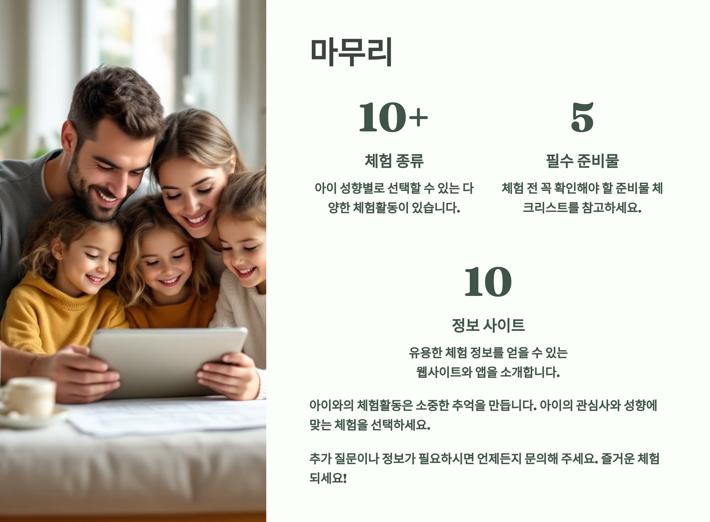 아이에게 가장 기억에 남는 건 장난감이 아니라 함께한 시간이에요. 체험활동은 단순히 배우는 것을 넘어 아이와 부모가 마음을 나누는 기회가 돼요. 💞