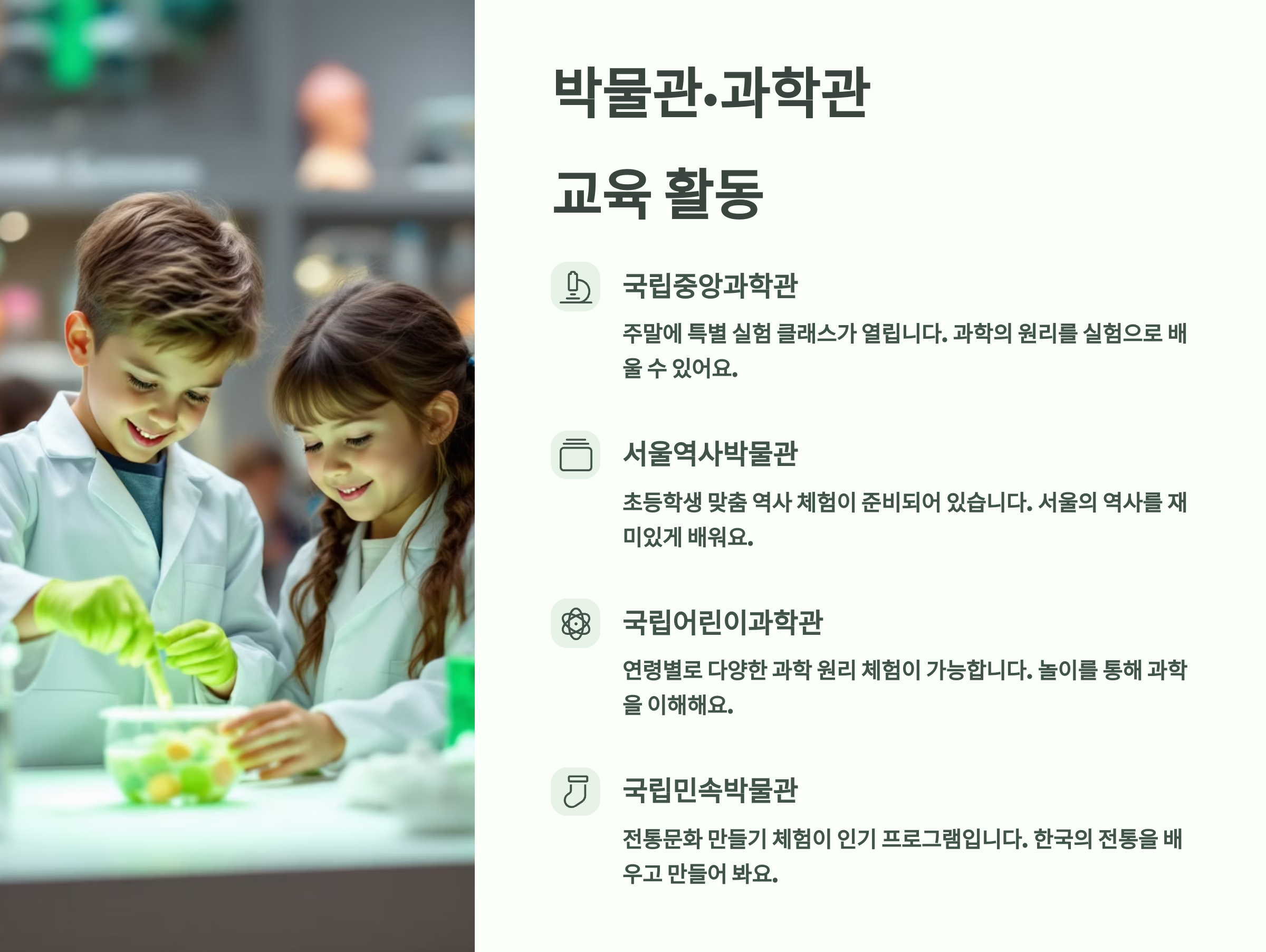 다음은 🏛️ 박물관·과학관 교육 활동 지루할 거란 편견은 NO! 전시 + 체험 + 놀이가 하나로 어우러진 똑똑한 공간이에요! 🔍🧪
