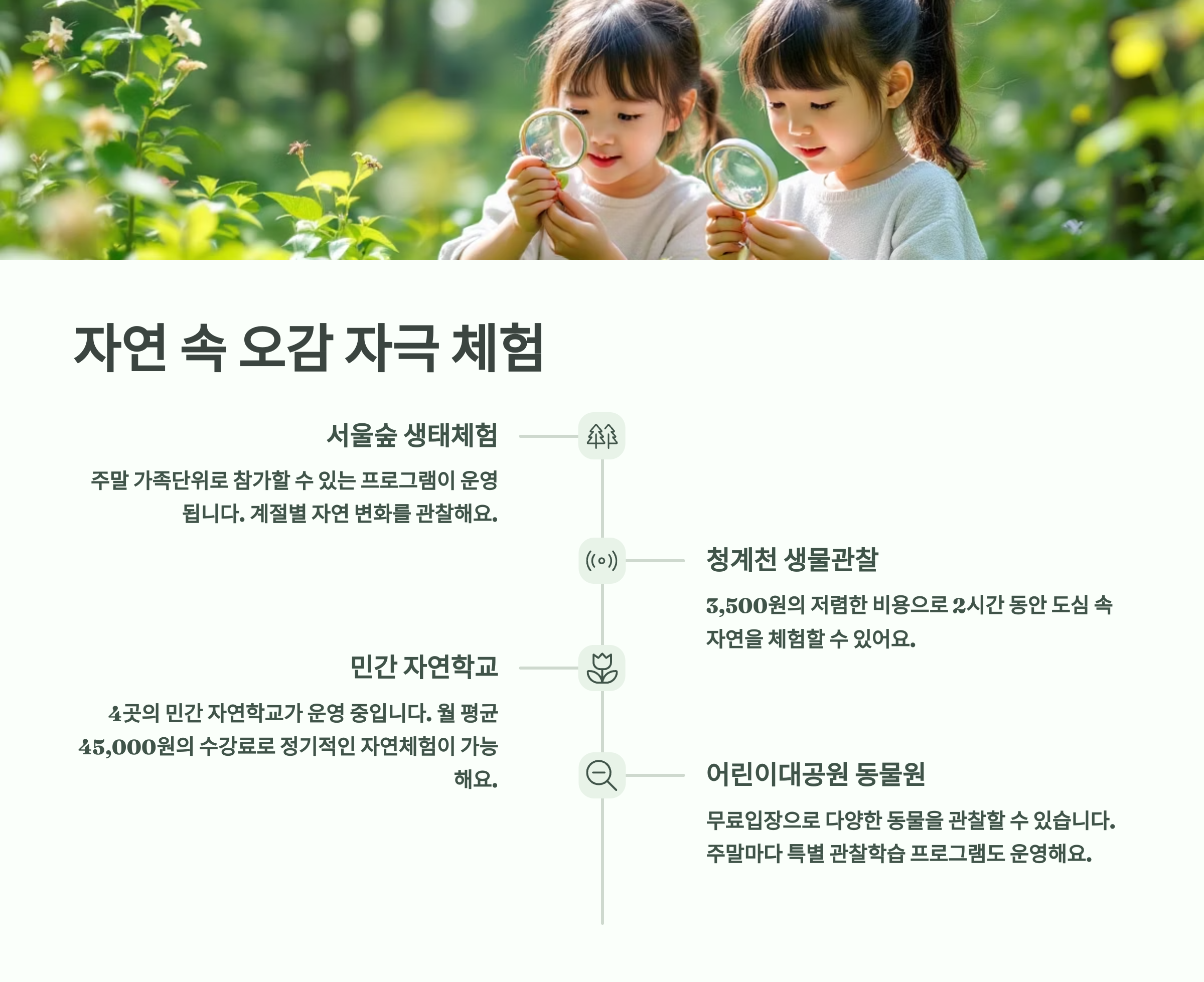 다음은 🌲 자연 속 오감 자극 체험 뛰놀며 보고 듣고 만지고, 아이의 모든 감각이 열리는 활동들이에요! 🍃👣