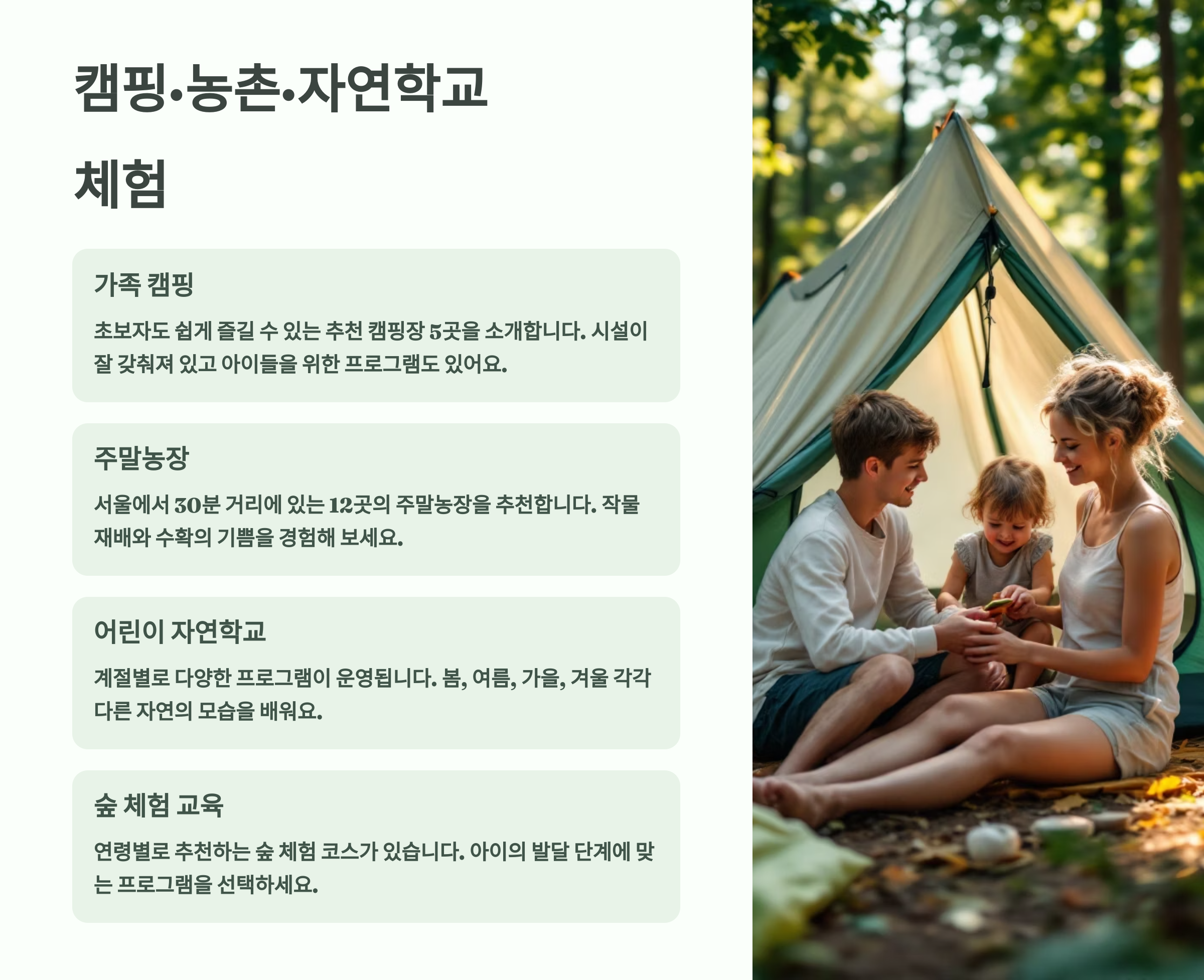 다음은 🏕️ 캠핑·농촌·자연학교 체험 자연에서 자립심·감성·관찰력을 기를 수 있는 장기 체험 활동을 소개할게요! ⛺🌽🧺