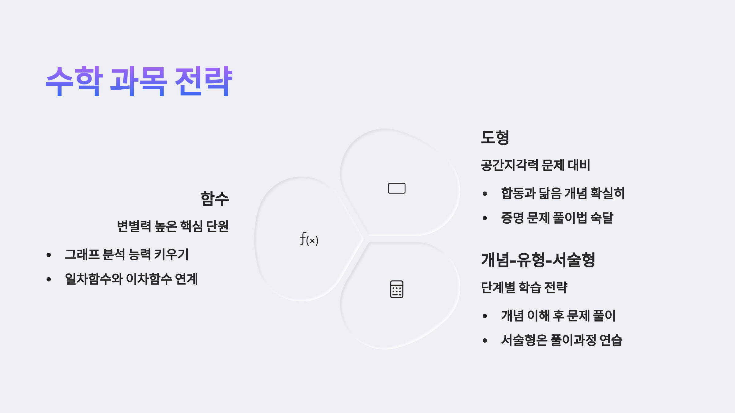 📊 3단계: 시험 전 단원별 핵심 정리 시험 2주 전에는 전체 단원을 빠르게 회독하면서 각각의 개념 흐름을 다시 연결해보세요. 단원 간 연계성이 중요한 함수·도형 단원은 특히 구조적으로 정리해두는 게 좋아요.