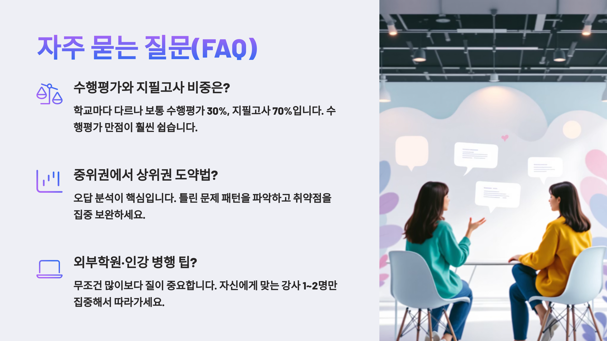 A6. 이유는 개념이 정확하지 않아서예요. 문제풀이보다 먼저 개념을 완전히 내 걸로 만든 뒤, 유형별 반복으로 ‘풀이 공식화’를 해보세요. 시간이 줄고 정확도는 올라갑니다.