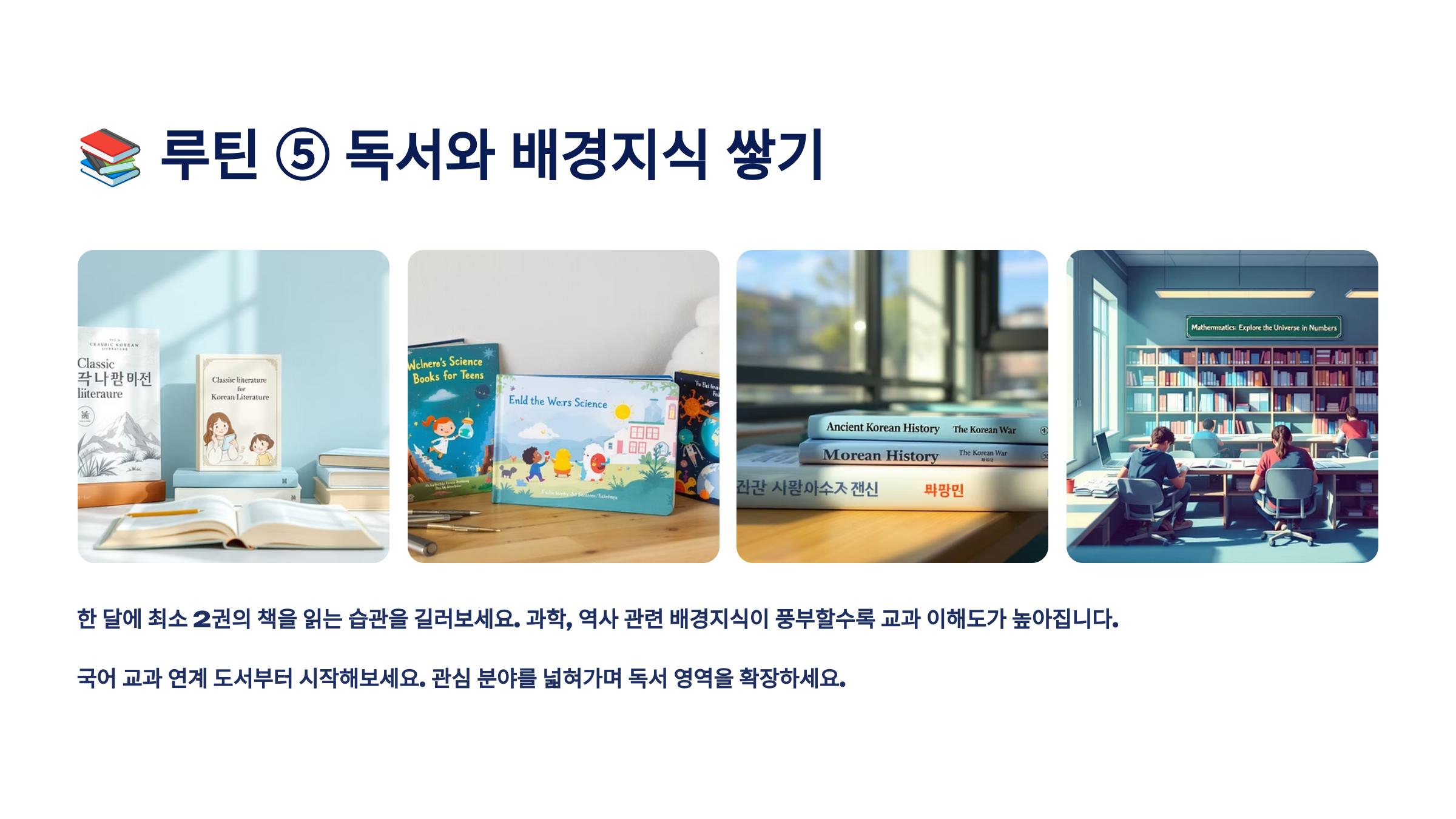 📚 독서는 억지로 하기보다는 자신이 좋아하는 분야부터 시작하면 좋아요. 과학 잡지, 역사 만화, 시사 주간지, 자기계발서 등 교과와 연계되는 주제라면 무엇이든 OK! 하루 10분씩만 읽어도 큰 차이를 만들 수 있어요.