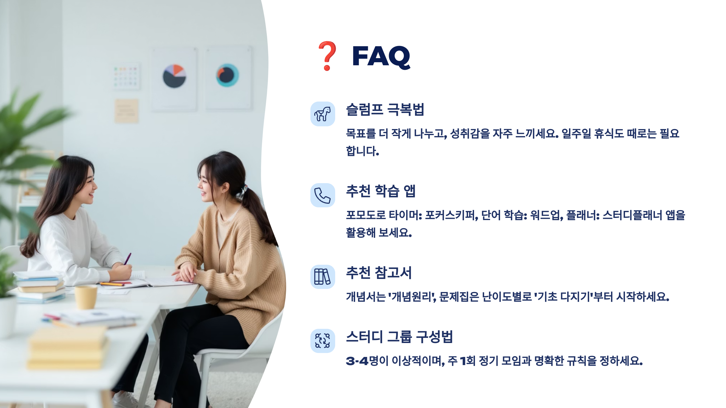 ❓ 이제 궁금한 점을 모아놓은 FAQ로 넘어가자! 공부 습관에 대한 자주 묻는 질문들만 쏙쏙 뽑아 정리했어 😊