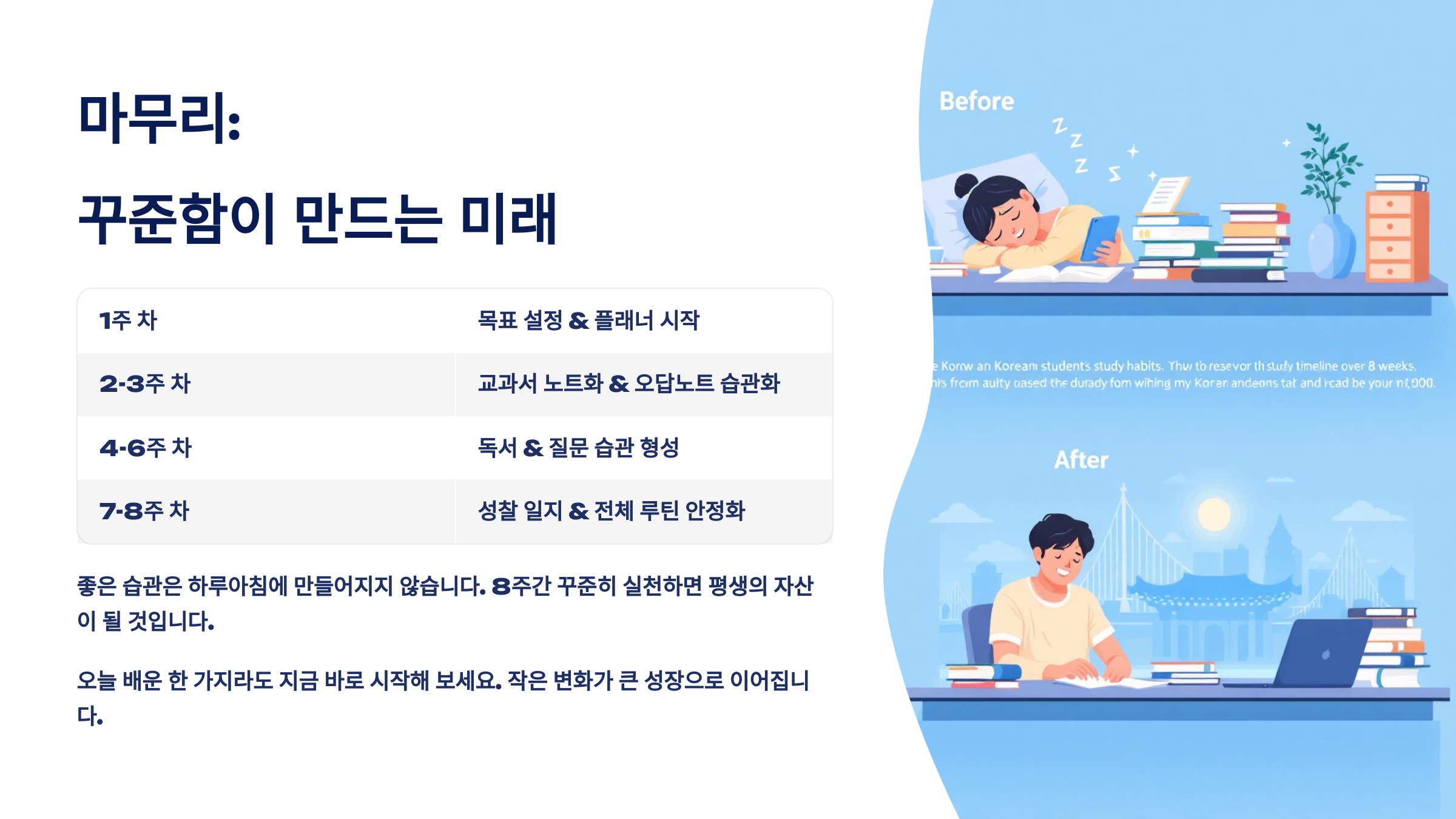 A8. 지금 바로예요! 학기 중, 방학, 시험 기간 모두 적기예요. 오늘이 공부 습관의 첫날이라는 마음으로 시작해보세요 😊