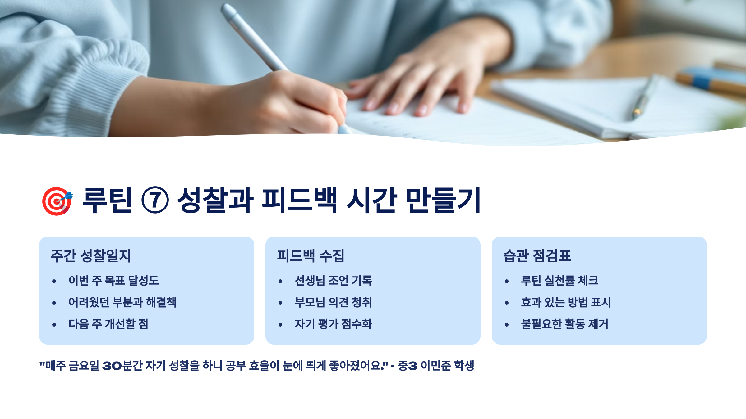 📒 공부 루틴의 완성은 바로 성찰과 피드백이에요. 공부를 잘하는 아이일수록 하루를 마치고 "오늘 뭐가 잘됐지?", "뭐가 아쉬웠지?"를 스스로 점검해요. 이게 바로 공부의 내공을 쌓는 과정이에요.