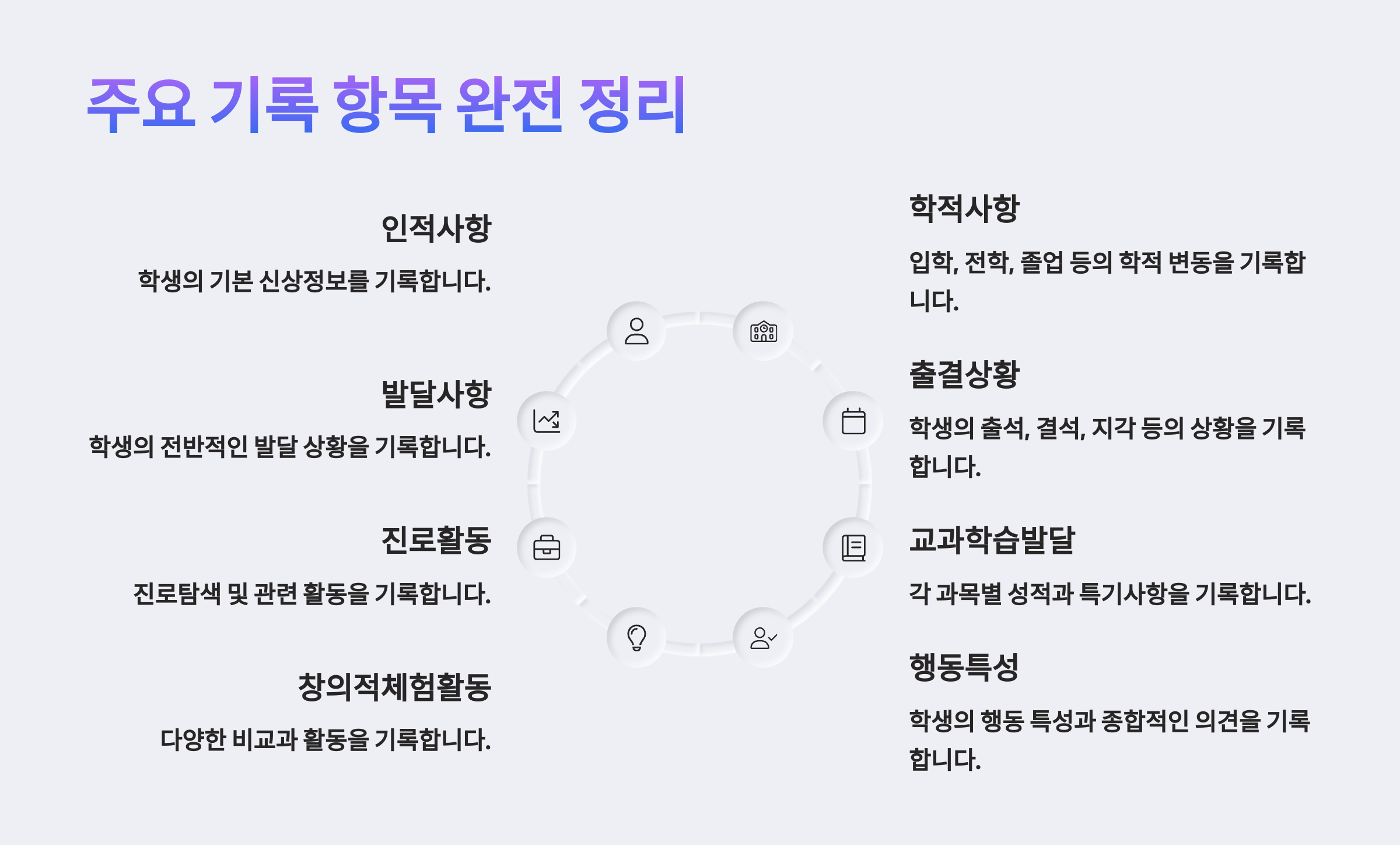 | 출결 및 인적사항 | 기본 정보, 출석 상황 등 | 학교 기본 생활 태도 기록 |