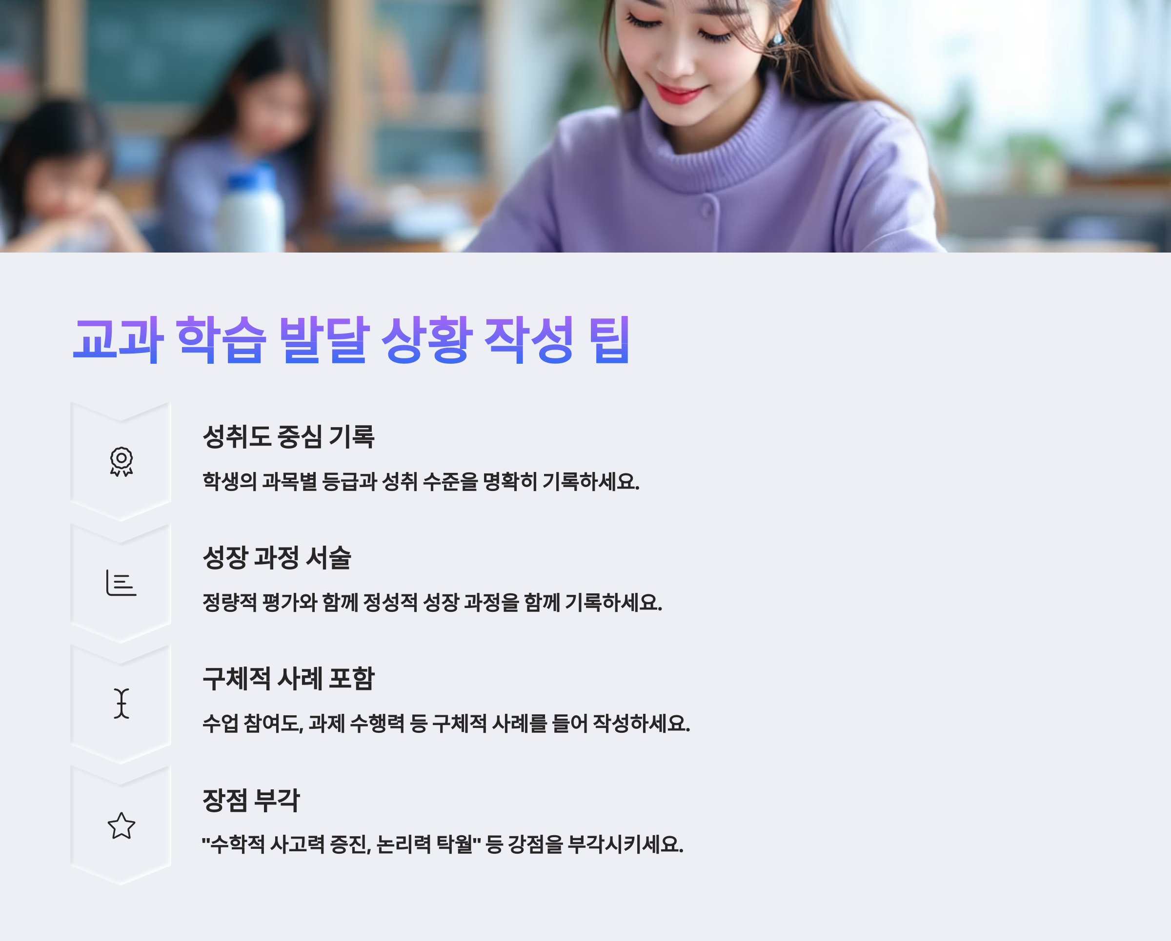 교과 학습 발달 상황은 ‘내가 수업을 통해 어떤 사람으로 성장했는지’를 보여주는 중요한 항목이에요. 수업을 단순히 듣는 것이 아니라, 적극적으로 살아가는 시간으로 만들어보자구요! 🌟