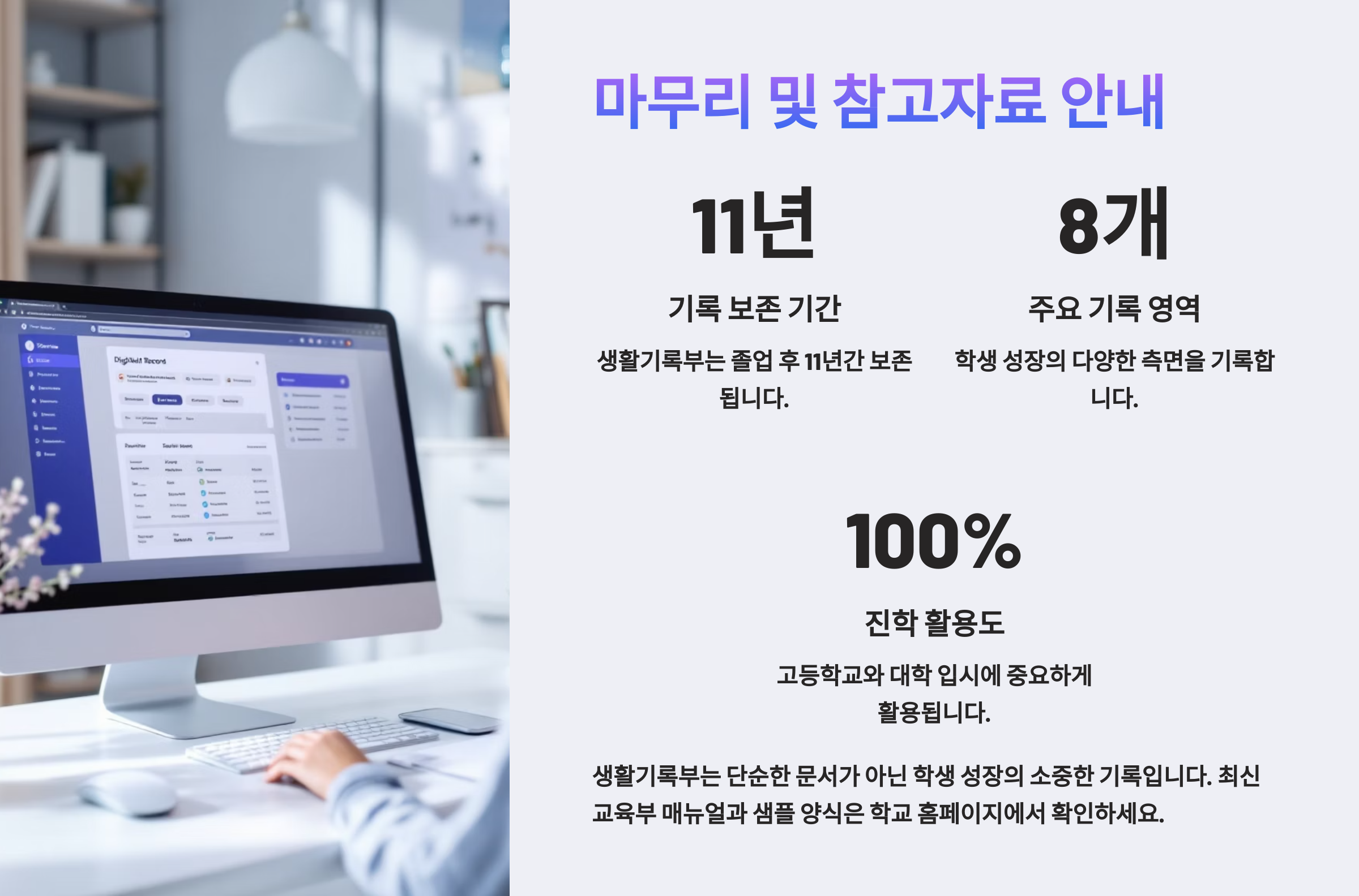 생활기록부는 성적만 보는 문서가 아니라, 학생의 삶 전체를 담는 성장 기록지예요. 아이의 미래를 위한 첫 번째 자기소개서라고도 할 수 있죠! 💬📝