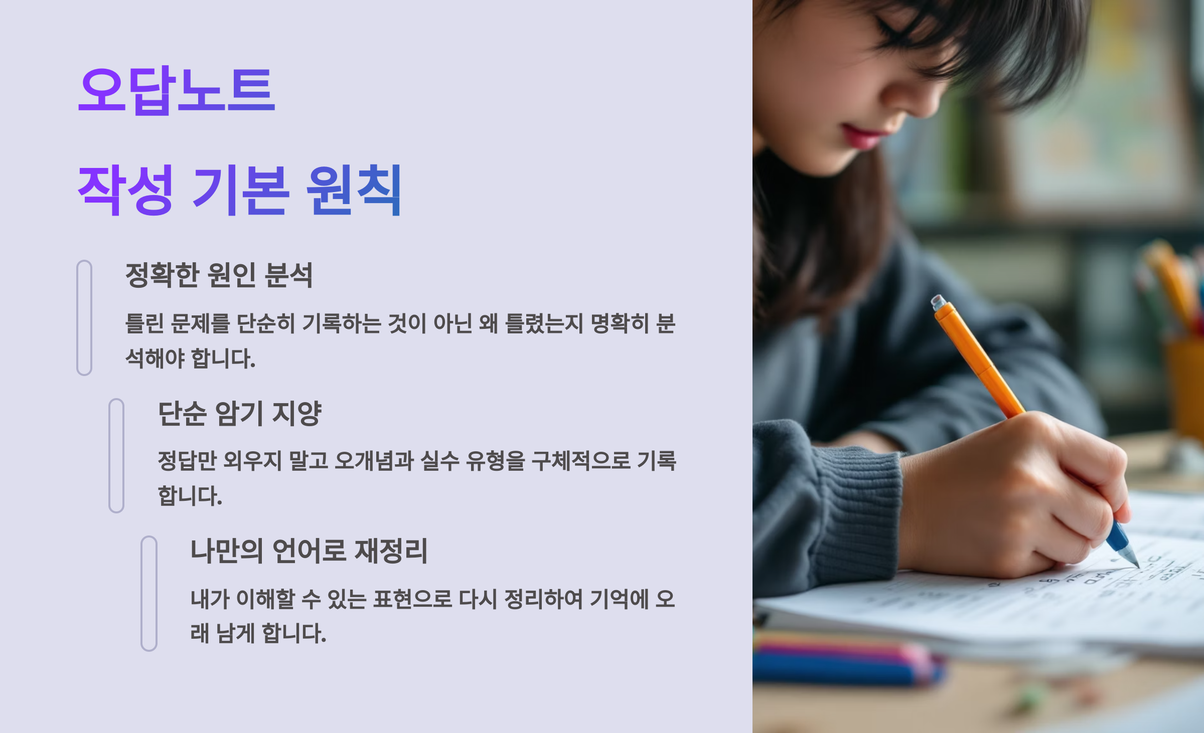 오답노트를 아무렇게나 적는다고 해서 실력이 쑥쑥 오르는 건 아니에요. 효과를 극대화하려면 제대로 된 방법과 원칙을 지켜야 해요!