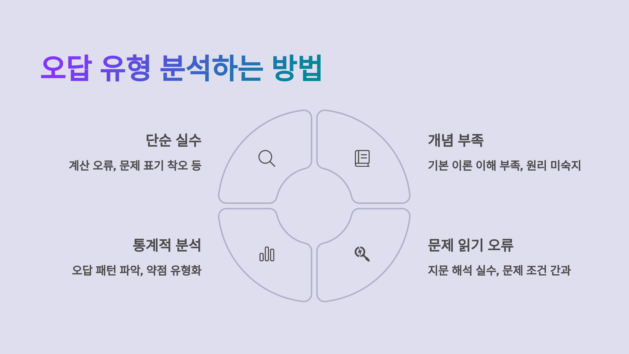 두 번째, 문제 해석 오류형 분석이에요. 문제 자체는 풀 수 있는데, 질문을 잘못 이해해서 오답을 내는 경우에요. 이럴 땐 문제를 천천히 읽고, 질문 의도를 정확히 파악하는 훈련이 필요해요. 🔎