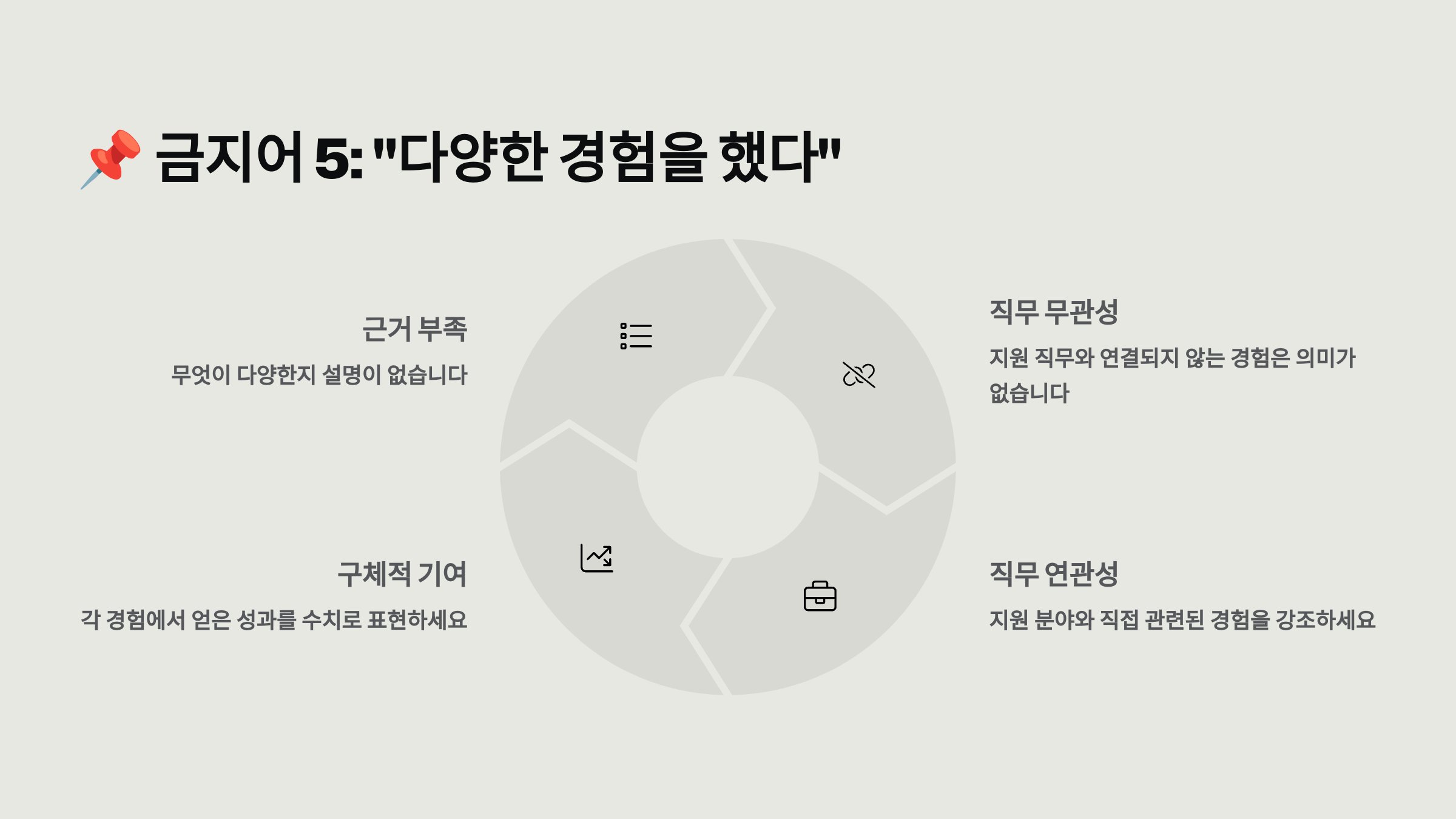 특히 요즘처럼 수많은 지원서가 쏟아지는 시기에는 뻔한 표현, 식상한 문장, 신뢰를 떨어뜨리는 문구는 읽히지도 않고 바로 걸러질 가능성이 커요. 실수로라도 자주 쓰는 금지어를 무심코 적지 않도록 주의가 필요해요. 🚫🖊️