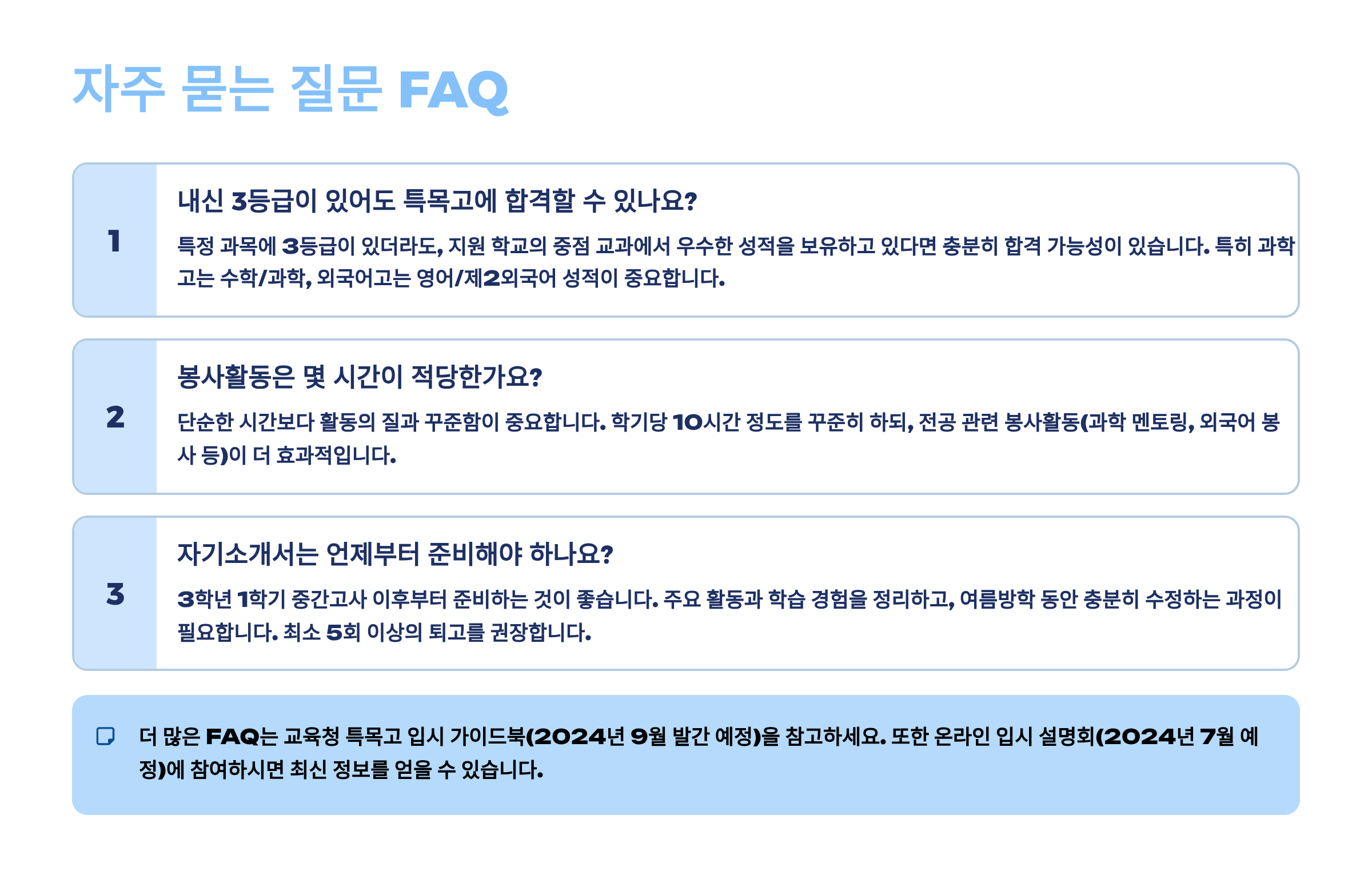 2025년 입시의 가장 큰 특징은 변화와 기회가 공존한다는 점이에요. 내신 5등급제 도입 예고와 고교학점제 시행으로 특목고의 장점이 더욱 부각되고 있고, AI와 디지털 역량이 새로운 평가 요소로 떠오르고 있어요. 이런 변화를 미리 파악하고 준비한다면, 남들보다 한 발 앞서 나갈 수 있을 거예요.
