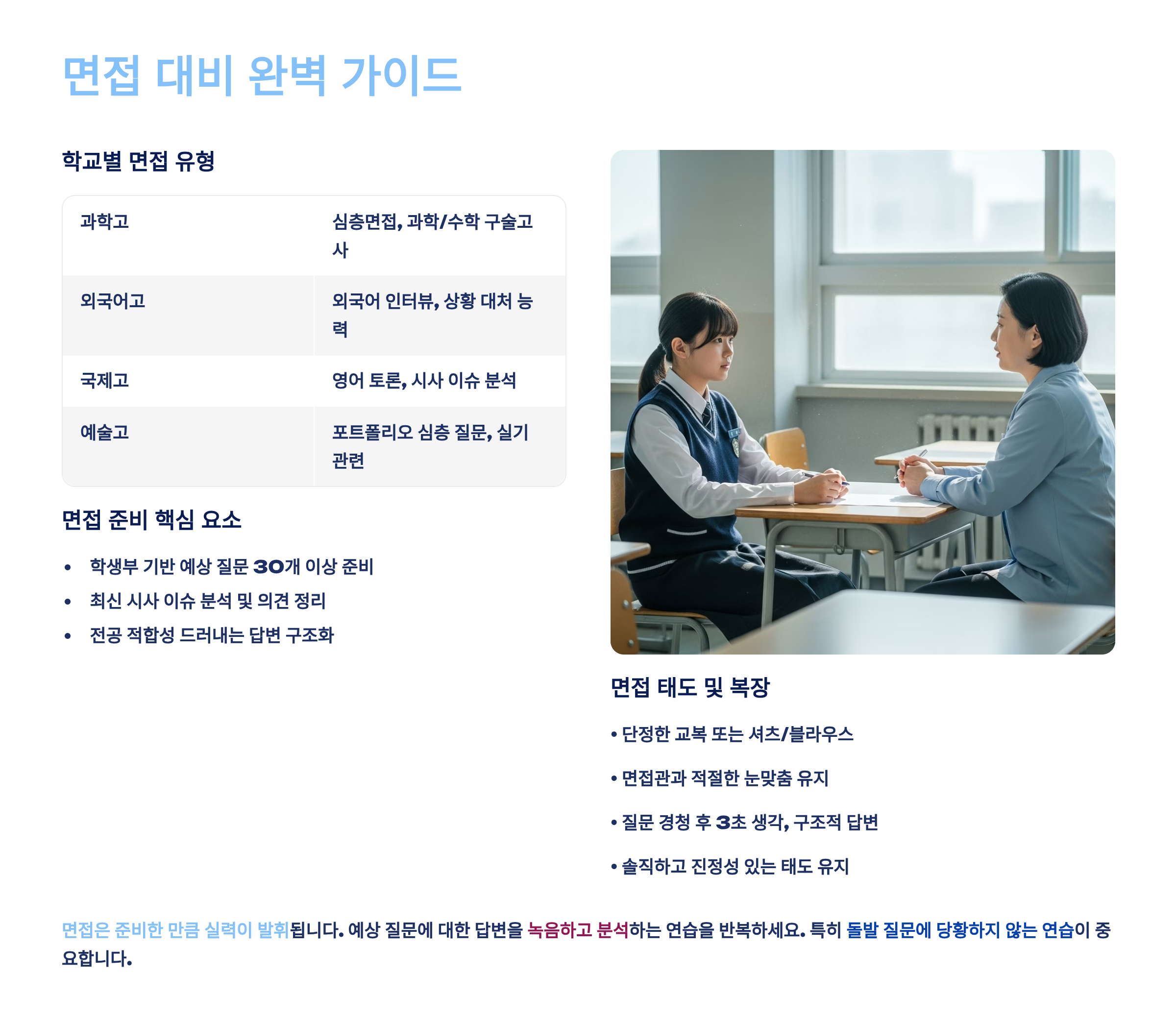 나의 생각으로는 모의 면접이 정말 중요해요. 학교 선생님이나 부모님께 면접관 역할을 부탁드리고, 실제와 같은 환경에서 연습해보세요. 카메라로 자신의 모습을 녹화해서 표정, 자세, 말투를 점검하는 것도 좋은 방법이에요. 특히 긴장했을 때 나오는 습관적인 행동이나 말투를 파악하고 고치는 것이 중요해요. 면접 당일에는 깔끔한 교복 차림으로, 밝고 자신감 있는 모습을 보여주세요!