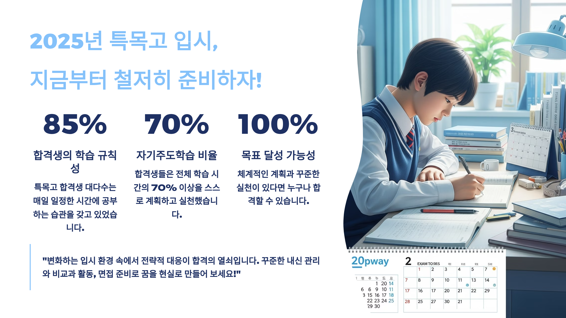 가장 중요한 것은 자신만의 목표와 계획을 세우는 거예요. 무작정 특목고를 목표로 하기보다는, 왜 그 학교에 가고 싶은지, 그곳에서 무엇을 배우고 싶은지 명확히 해야 해요. 진정성 있는 목표는 힘든 입시 과정을 버티게 해주는 원동력이 되고, 면접에서도 빛을 발할 거예요.