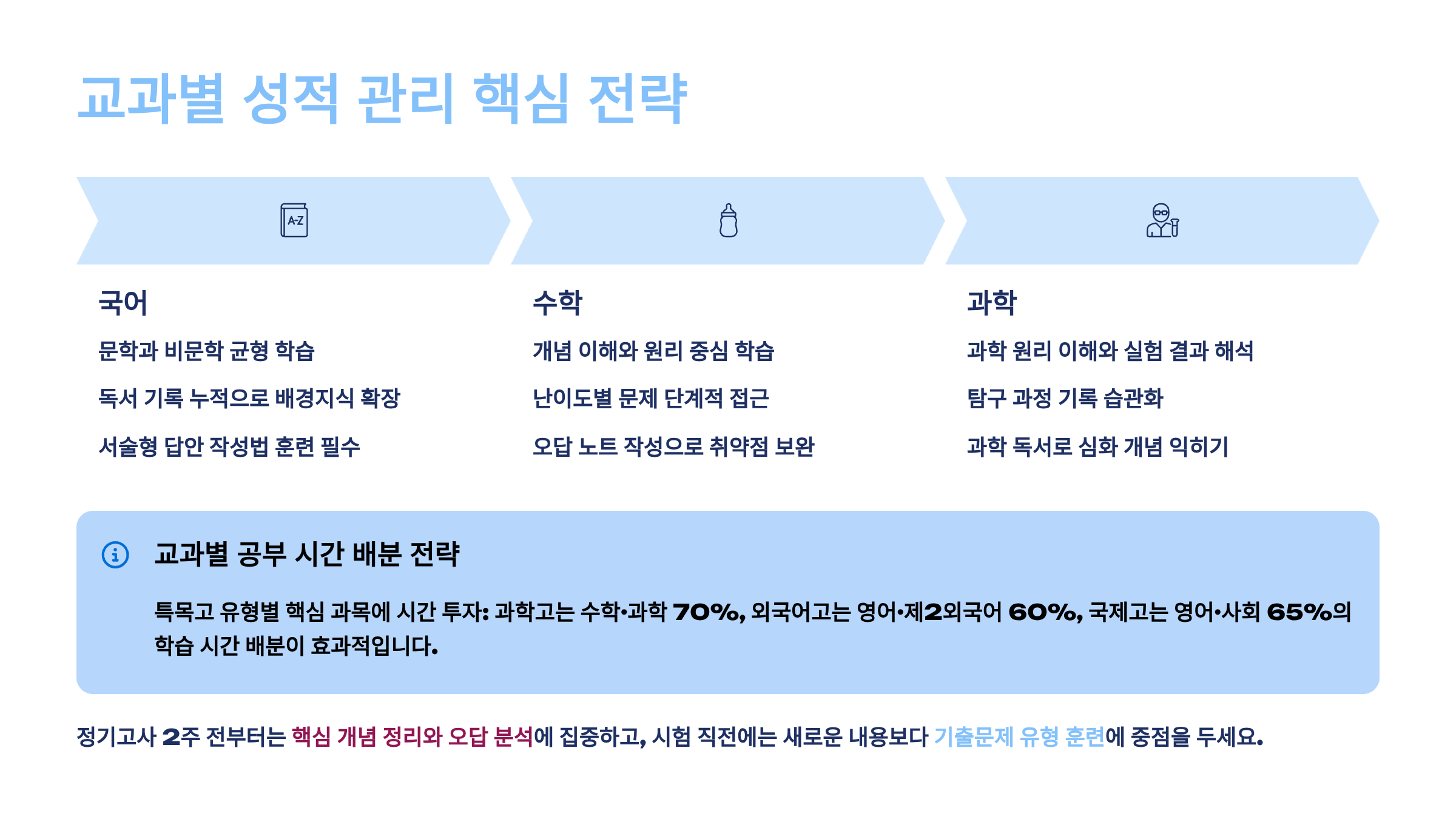 특목고 합격을 위한 교과별 성적 관리 전략은 정말 중요해요! 💪 먼저 국어 과목은 독해력과 문법 실력이 핵심이에요. 매일 신문 사설을 읽고 요약하는 습관을 들이면 독해력이 크게 향상돼요. 특히 비문학 지문 분석 능력이 중요한데, 문단별로 핵심 내용을 정리하고 글의 구조를 파악하는 연습을 꾸준히 해야 해요. 문법은 중학교 전 범위를 체계적으로 정리하고, 틀리기 쉬운 맞춤법과 띄어쓰기를 완벽하게 마스터해야 합니다.