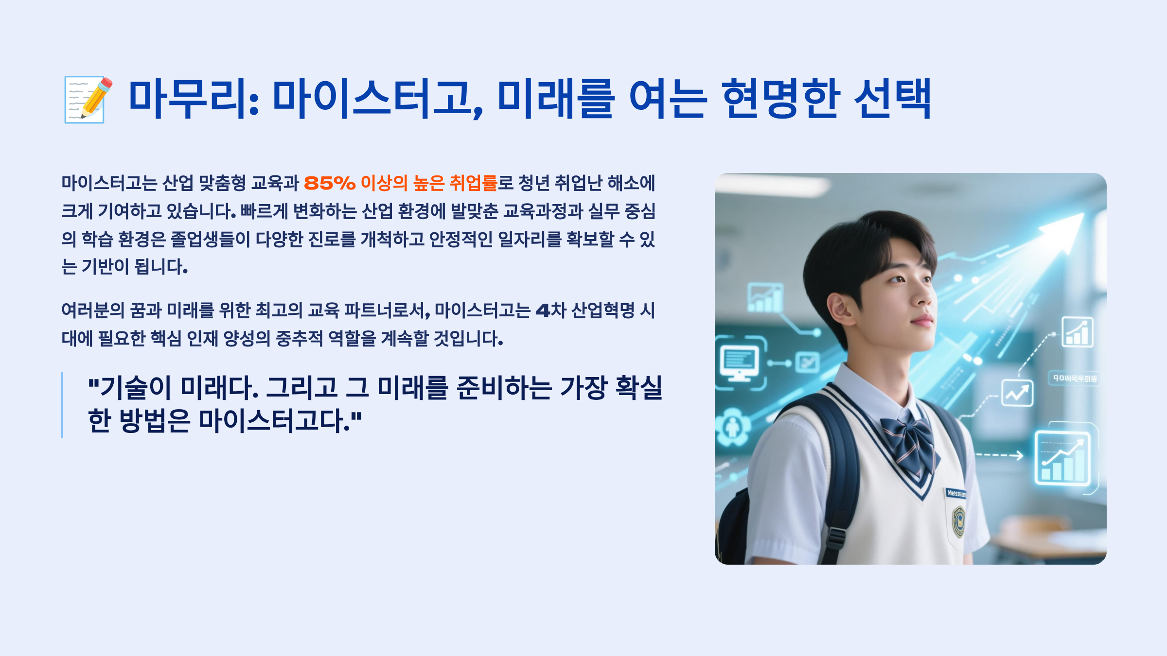 2025년은 마이스터고에게도, 여러분에게도 특별한 해가 될 거예요. AI, 반도체, 신재생에너지 등 미래 산업이 급성장하면서 전문 기술 인력의 가치가 더욱 높아지고 있어요. 이런 시대적 흐름 속에서 마이스터고는 최고의 선택이 될 수 있답니다. 여러분의 꿈과 미래를 마이스터고에서 펼쳐보세요! 응원할게요! 💪✨